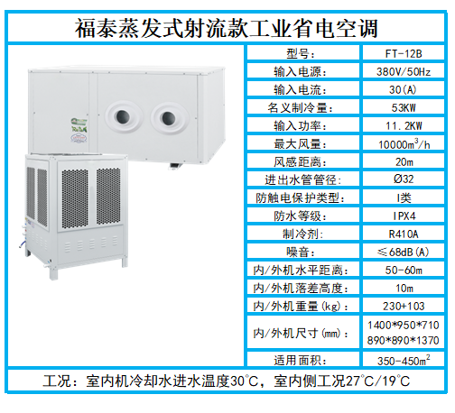 工業省電空調采用水冷、風冷、蒸發冷以及壓縮機相結合的方式進行制冷降溫。通過濕簾蒸發式冷凝技術給循環水降溫,再流經內機的換熱器。壓縮機將冷媒壓縮成高溫高壓的氣態,并帶走其熱量,形成常溫液態冷媒。隨后,經過膨脹閥節流后,變成低溫低壓的液態冷媒,流入內機的蒸發器與室內熱空氣進行熱交換,吹出冷風。這一過程周而復始,將能效比發揮到最大。
